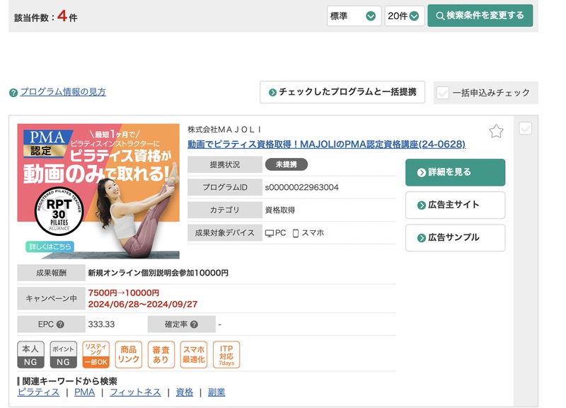 各アフィリエイトサービスにログインし、プログラム検索画面で「MAJOLI」と検索することで、MAJOLIのアフィリエイトプログラムが表示されます。