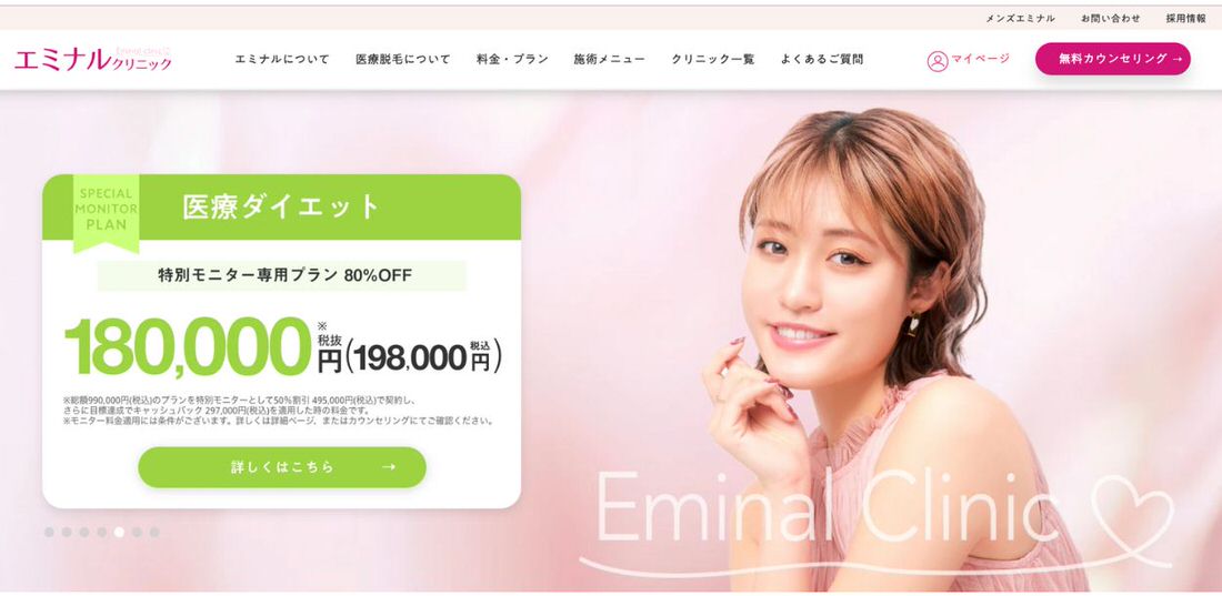 2024年5月時点では、特別モニター専用プラン「医療ダイエット3ヶ月コース」が最高80%OFF(198,000円/税込)で受けられます。