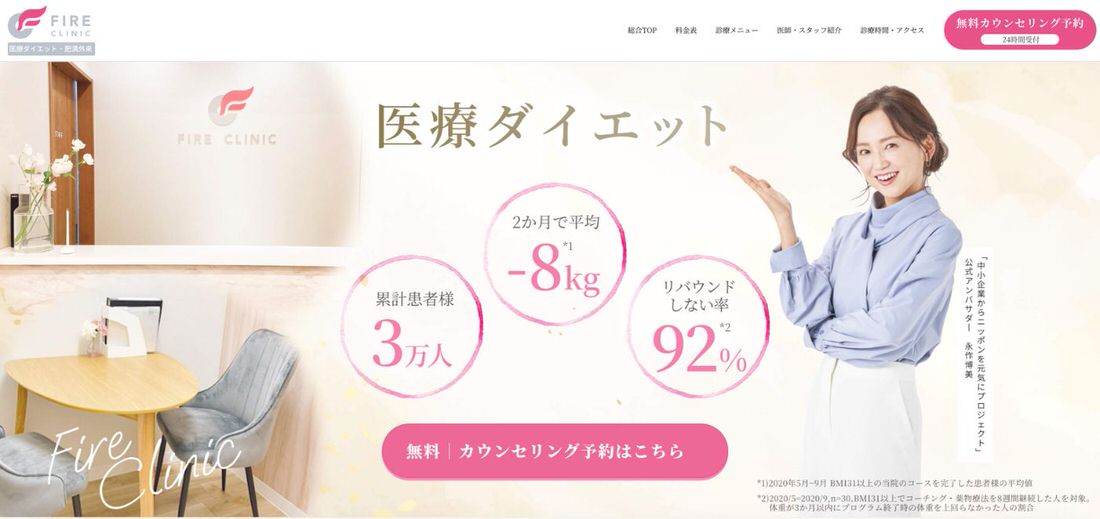 ファイヤークリニックは、リバウンドしない率92%、2ヶ月で平均マイナス8kgを実現しているクリニックです。理想の姿を実現できる独自の「ファイヤーメソッド」は、以下の3つを掛け合わせたものです。