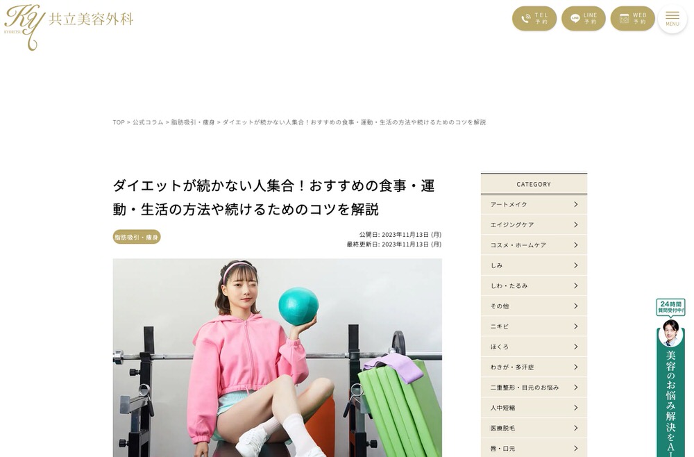 「共立美容外科」は、美容医療の専門クリニックとして全国に複数の院を展開し、豊富な施術メニューと専門的な知識で多くの患者に支持されています。公式サイトでは、ダイエットや美容に関するコラムを多数掲載しており、専門的な知識をわかりやすく解説しています。