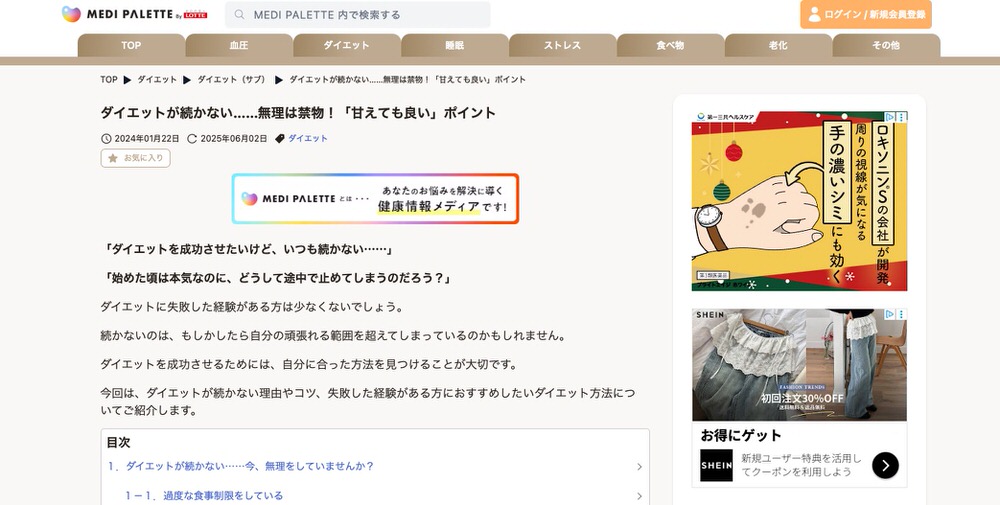 「MediPalette」は、ロッテが運営する健康情報メディアです。ダイエット、食事、睡眠、ストレスなど、日常生活に密着したテーマを扱っています。