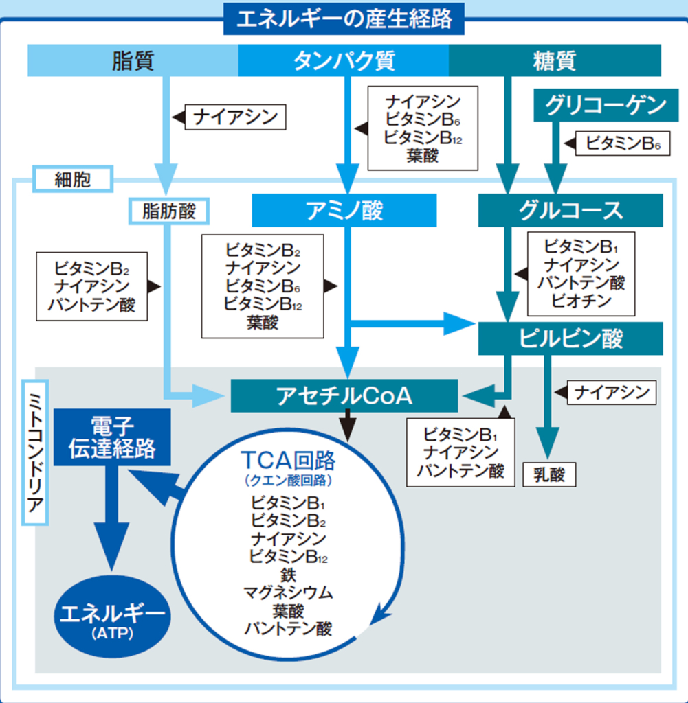 ビタミンのなかでも、エネルギー代謝には特に「ビタミンB群」が重要です。ビタミンB群は、さまざまな化学反応を引き起こすための触媒になる酵素の働きを助ける「補酵素」の役割を果たします。