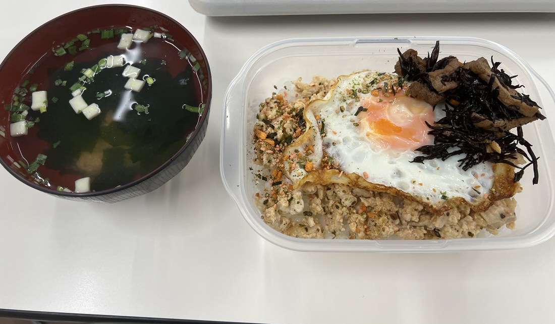 弁当の内容は、目玉焼き、鶏ひき肉、ご飯、ひじきです。鶏ひき肉は市販のガパオライスの素を使い味付けをしています。内容量を細かく調整でき、シンプルかつとても美味しいのでおすすめです。