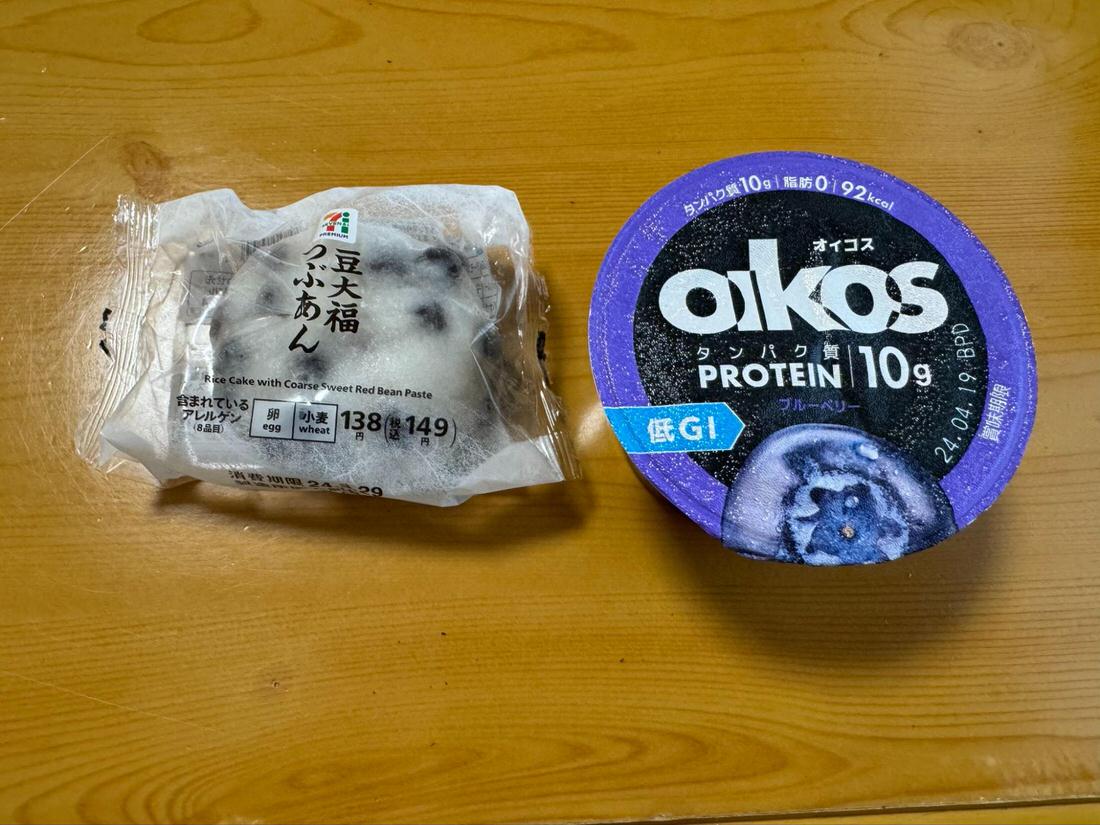 間食の内容としては、脂質を抑え、タンパク質と糖質をメインに摂取してください。こちらはプロテインとベーグルですが他にも、バナナ、餅、さつまいも、和菓子、プロテインバー、サラダチキンなどが手軽に食べることができるためおすすめです。