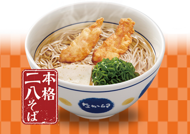 「とり天そば」は、温かいそばつゆに本格的な二八そばを使用し、鶏天ぷらをトッピングしたメニューです。