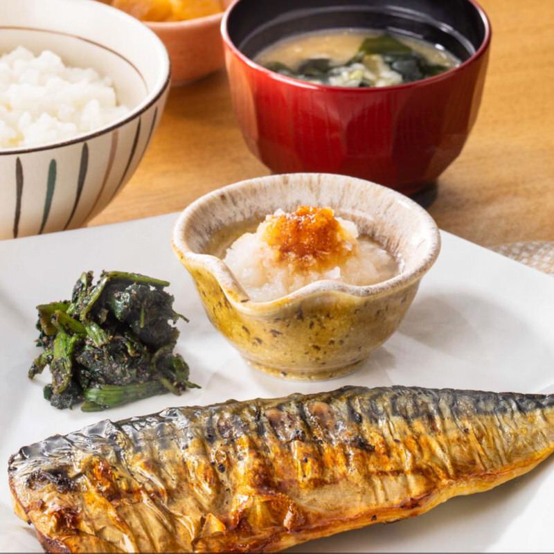 「さばの炭火焼き」は、脂がのったさばを炭火でじっくり香ばしく焼き上げたメニューです。おろしたての大根おろしが添えてあり、一緒に食べることで消化を助けます。