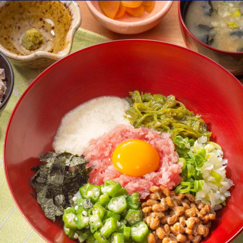 「大戸屋ばくだん丼」は、低カロリー・高たんぱく質のメニューです。納豆やめかぶ、オクラ、山芋などのねばねば食材がたっぷりと含まれていて、腸内環境改善が期待できます。