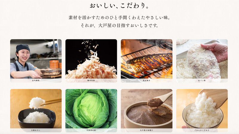 大戸屋は、素材を活かすためのひと手間を加えたやさしい味を目指しています。また、注文が入ってから一品ずつお店でこしらえることを大切にしています。