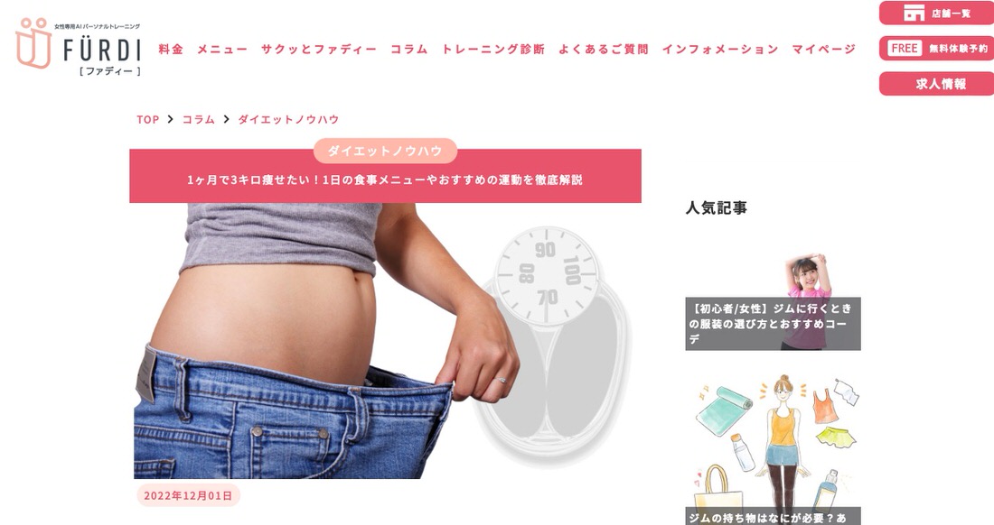 おすすめの減量スケジュールサイト3つ目は、「FURDI」です。「FURDI」では1ヶ月で無理なく確実に3kg痩せるための基礎知識や、食事法、運動法を紹介しています。