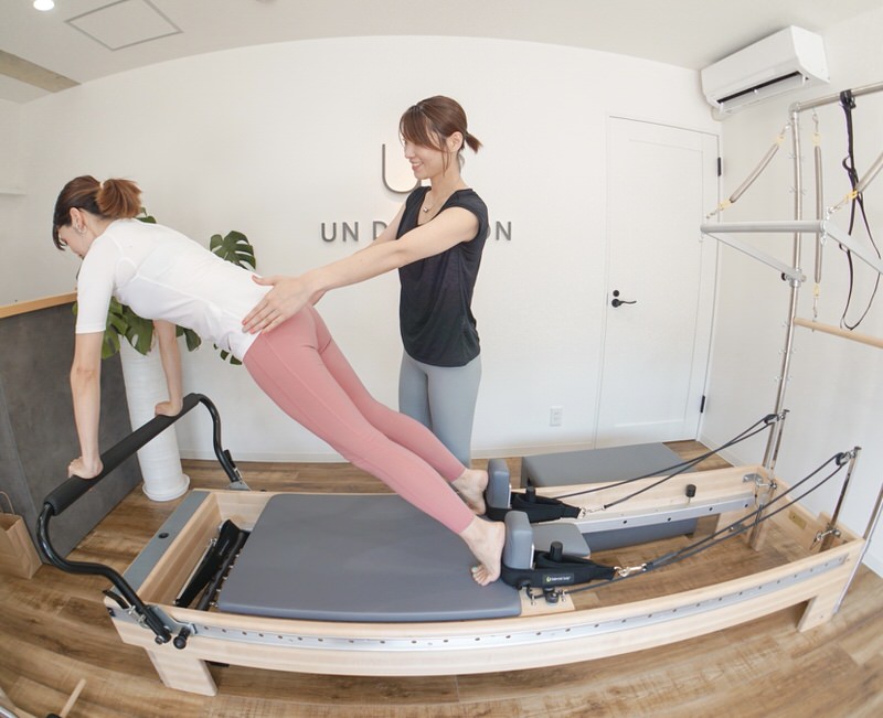 UN DELUSIONは、大津駅にあるマシンを利用したピラティススタジオです。レッスンではなくセッションと呼んでおり、インストラクターと生徒が一緒に考え、体の状態に寄り添いながら一緒に理想の体づくりを行なっていきます。