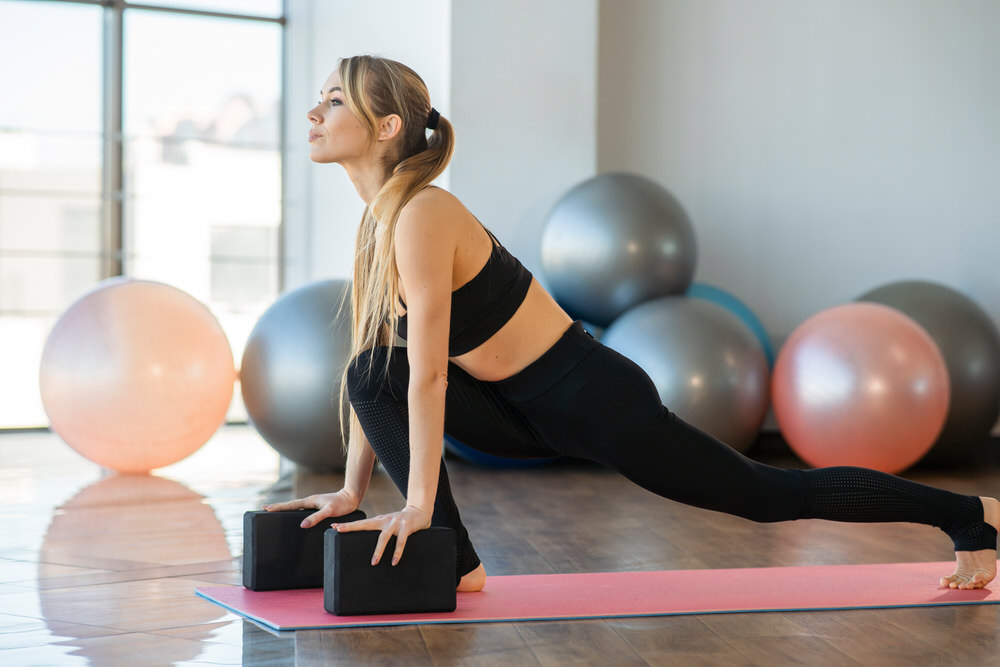 2個のヨガブロックを前の足の両サイドへ置き、手をブロックにそえてポーズをとってみましょう。股関節がしっかりアプローチされ、腰への負担をかけずに背骨をキレイに伸ばすことができます。